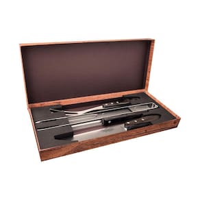 Lâminas de aço inox. Lâmina da faca com maior durabilidade do fio devido ao tratamento térmico. Lâminas do garfo e pegador que contam com maior espessura e uma estampagem do aço que garante maior resistência, evitando deformações. Cabos de madeira tratada Polywood resistentes à impactos e altas temperaturas, garantindo maior resistência e durabilidade. Rebites de aço inox.Caixa de papelão.Podem ir à máquina de lavar louças facilitando seu dia a dia.