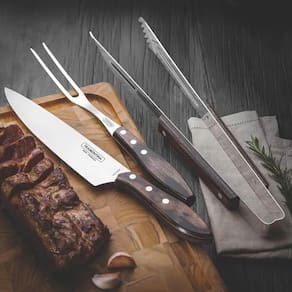 Conteúdo: Faca para Carne 8" Polywood; Garfo Trinchante Polywood; Pegador de Carne Polywood.