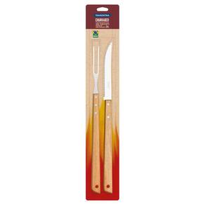 Jogo Trinchante Tramontina em Aço Inox e Madeira 2 peças Para o seu churrasco sair perfeito e você se tornar um churrasqueiro de respeito, tem que ter o Jogo Trinchante Tramontina com Lâmina em Aço Inox e Cabo Madeira 2 peças. Um jogo da linha Churrasco desenvolvido para quem sabe apreciar o verdadeiro churrasco, oferecendo utensílios essenciais para tornar a tarefa ainda mais prática. O garfo trinchante e a faca são produzidos com lâminas em aço inox e com cabos de madeira, que além de qualidade e durabilidade, levam para o ambiente mais beleza. Informações Gerais Lâminas de aço inox.A lâmina da faca têm maior durabilidade do fio devido ao tratamento térmico.A lâmina do garfo trinchante conta com maior espessura e uma estampagem do aço que garante maior resistência, evitando deformações.Os cabos são de madeira natural.Rebites de alumínio.