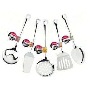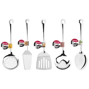 Jogo Utensílios em Inox 5 Peças Kit Utensílios de Cozinha Conjunto de Talheres Linha Inox OrienteEste Kit é ideal para sua cozinha, com ele é possível servir sopas, cremes, feijão, molhos, arroz, frituras e muito mais, e não podemos esquecer da sobremesa, com a espátula de bolos que acompanha este kit.