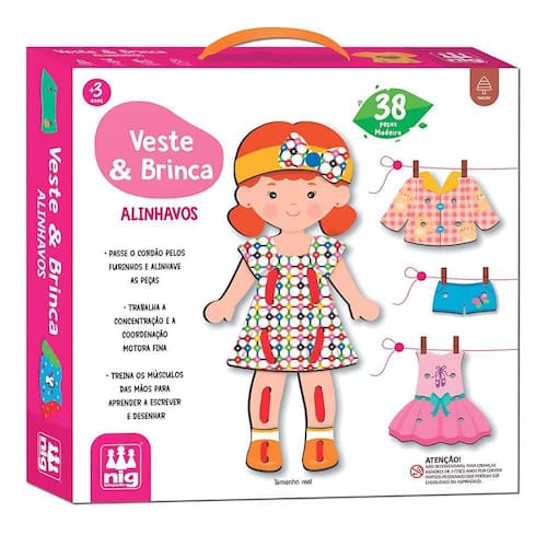 Jogo Veste E Brinca Alinhavos - Nig Brinquedos O jogo Veste e Brinca Alinhavos, da NIG Brinquedos, é uma atividade Montessori que estimula o desenvolvimento da coordenação motora fina, essencial para preparar as crianças para escrever e desenhar. Além de treinar a coordenação olho-mão e a percepção espacial, o jogo promove a concentração de forma divertida. O kit inclui uma boneca de 26 cm e 37 pecinhas em madeira, com lindas roupinhas e acessórios, além de 06 cadarços coloridos para prender as peças. Uma maneira lúdica e educativa de aprender enquanto brinca de moda e estilo! Código: 103580 Dimensões aprox. da embalagem em cm: 7x34x31 Peso liq. Aproximado do produto na embalagem: 711g Referência do modelo: 0474 Certificado Inmetro: 006513/2021 Conteúdo da embalagem: 01 boneca de madeira, 37 roupinhas, 06 cordões coloridos, acessórios em madeira. Composição/material: madeira mdf, papel microondulado, cordão de poliéster Garantia: 90 dias contra defeitos de fabricação pelo fabricante. Imagens meramente ilustrativas. As cores e tonalidades podem variar. Gênero - Meninas Meninos Unissex Idade - 3 anos 4 anos 5 anos 6 anos 7 anos 8 Anos Tipo - Estratégia Habilidade Jogo Pedagógico Memória Raciocínio Lógico