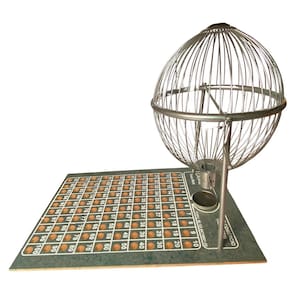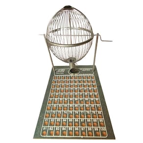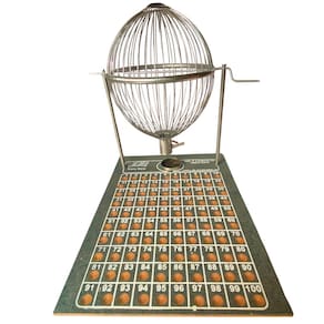 Jogo vispora completo com globo em metal, tabuleiro em madeira MDF com cavidades numeradas para as bolinhas sorteadas e 100 bolinhas de plástico numeradas.