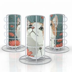 Design Exclusivo e Encantador: Cada xícara apresenta a estampa adorável de um gatinho fofo e flores delicadas, transformando cada gole em um momento de pura alegria. Seus convidados vão se encantar! Qualidade Premium em Cerâmica: Desfrute da durabilidade e do toque suave da cerâmica de alta qualidade. Ideal para bebidas quentes e frias, mantendo a temperatura da sua bebida por mais tempo. Organização Inteligente e Otimização de Espaço: Cansado de armários bagunçados? Nosso suporte de metal elegante permite empilhar as 4 xícaras verticalmente, liberando espaço valioso e criando um visual moderno e arrumado no seu "cantinho do café". Capacidade Ideal para o Dia a Dia (150ml): Perfeitas para um café espresso duplo, chá, ou qualquer bebida que peça uma dose de conforto. O tamanho compacto de 5cm de altura é ergonômico e charmoso.