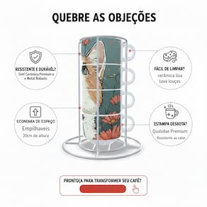 "Será que é resistente?" Sim! Nossas xícaras são feitas de cerâmica de alta qualidade, projetadas para o uso diário. O suporte de metal robusto garante estabilidade e durabilidade, protegendo suas xícaras.