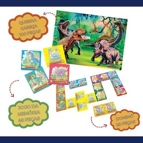 Kit de Jogos 3 em 1 - Quebra-Cabeça, Memória e Dominó - Dinossauros