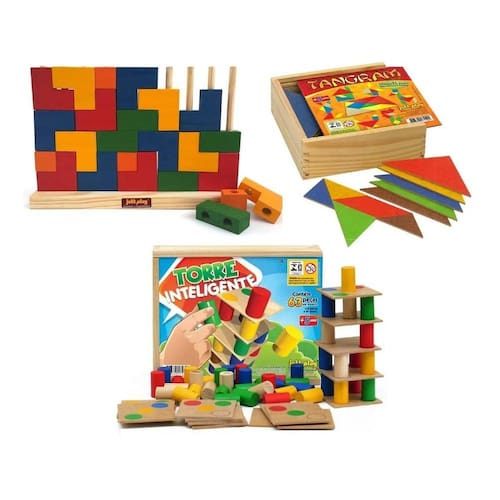 Brinquedos que ensinam, educam e divertem Bloco de encaixe verticalBase em madeira tamanho 33 x 22 x 6 cm com 10 pinos para encaixe das peças + 25 peças geométricas coloridas com furos para serem encaixados na base.Pode ser usado também como um quebra cabeça / puzzle vertical.Desenvolve o raciocínio lógico, concentração, seriação e classificação. Tangram 10 jogos mdf com cores diferentes 70 peças caixa em madeira.Uso: o desafio de montar formas diversas com as peças do tangram é motivador, e desenvolve a criatividade e a paciência.O nível de dificuldade vai depender da proposta do professor ou adulto que estará orientando a criança, que poderá variar desde a criação de figuras inventadas até figuras com alto grau de dificuldade.Exige o uso da percepção visual, discriminação de formas, da capacidade de análise, e síntese e da organização espacial.Desenvolve: criatividade, paciência, percepção de formas, capacidade de análise, síntese e organização espacial.Composição: jogo chinês, milenar, composto por 10 conjuntos de 7 figuras geométricas em mdf formando um quadrado de base 15cm.Tinta não tóxica. Caixa de madeira medindo 05x17x17cm. Torre inteligente 18 placas em mdf com 45 pinos coloridos.Jogo torre inteligente composto de 63 peças de madeira, sendo: 18 placas com pontos coloridos + 45 peças de madeira colorida.Acondicionado em caixa de madeira medindo 26x21x6cm.Certificado inmetro ce bri/003-n 3107-07