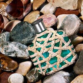 Design ou Praticidade: O frasco de 75ml, com corda tecida e vidro inspirado no mar, é elegante, compacto e prático para transporte, refletindo a estética artesanal da marca.