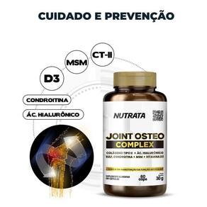 Descrição:O Joint Osteo Complex é um suplemento à base de colágeno tipo II derivado do frango em associação com ácido hialurônico, MSM, condroitina e vitamina D3. Sua formulação completa e balanceada fornece nutrientes para a saúde óssea e articular.Quando ingerir o Joint Osteo ComplexA partir de 25 anos de idade, há uma redução natural na produção de colágeno pelo organismo. Com uma suplementação adequada é possível reparar e prevenir danos causados por essa perda, promovendo a manutenção da saúde das articulações.Diferenciais:- Com MSM;- Com Condroitina;- Com Vitamina D3;- Com Ácido hialurônico;- 40mg de colágeno tipo II não desnaturado;- Auxilia na manutenção da função articular.Ingredientes:MSM metil sulfonil metano , sulfato de condroitina, hialuronato de sódio obtido pela fermentação de Streptococcus zoopidemicus, colágeno de frango com colágeno tipo 2 não desnaturado, aromatizante cúrcuma em pó, vitamina D3 colecalciferol , estabilizante amido, antiumectante dióxido de silício, cápsula: opacificante dióxido de titânio, gelatina e umectante glicerina . NÃO CONTÉM GLÚTEN.Sugestão de uso:Ingerir duas cápsulas ao dia ou conforme orientação de nutricionista ou médico.Conservação:Conservar o produto bem fechado, em local fresco, seco e ao abrigo de luz. Após aberto, consumir preferencialmente em até 60 dias.