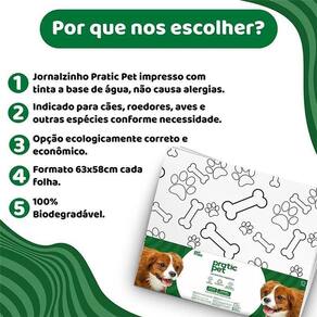 Jornal Higiênico Biodegradável para Pets 50 Folhas Produto exclusivo, desenvolvido para oferecer conforto, higiene e praticidade no dia a dia do seu pet Alta gramatura para máxima absorção 100% limpo, livre de químicas e odores Biodegradável e sustentável Diferenciais: Desenvolvido com o apoio de veterinários; Impresso com tinta à base de água, sem cheiro e sem toxinas; Cada folha é dobrada individualmente, facilitando o manuseio; Substitui com eficiência o tapete higiênico tradicional; Produção higiênica, livre de impurezas, insetos ou pragas; Não suja o chão; Tamanho 63x58 cm; Versátil: Além de ser ideal para o treinamento e higiene de cães e outros pets, também pode ser utilizado em atividades como pinturas, artesanato, reformas e muito mais. Por que escolher nosso jornal Ótima absorção; Armazenamento seguro e higienização de primeira qualidade; Prático e econômico: reduza o uso de água e o tempo gasto na limpeza de quintais e varandas. Seu pet merece o melhor e você também Sem Marca: Não Informado