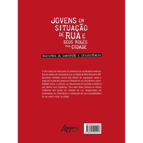 O livro lança um olhar para os processos de socialização vivenciados por jovens em situação de rua na cidade de Belo Horizonte-MG. Apresenta reflexões acerca dos efeitos da segregação social, espacial e racial na vida dos jovens em situação de rua, discutindo a invisibilidade social, os mecanismos de controle, a violência e o preconceito racial que sofrem. Para além disso, destaca as táticas cotidianas dos jovens em situação de rua, tangenciadas por movimentos de (re)existência e reinvenção de suas possibilidades de ser, viver e estar na cidade.