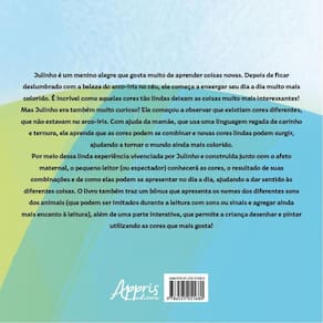 Julinho é um menino alegre que gosta muito de aprender coisas novas. Depois de ficar deslumbrado com a beleza do arco-íris no céu, ele começa a enxergar seu dia a dia muito mais colorido. É incrível como aquelas cores tão lindas deixam as coisas muito mais interessantes! Mas Julinho era também muito curioso! Ele começou a observar que existiam cores diferentes, que não estavam no arco-íris. Com ajuda da mamãe, que usa uma linguagem regada de carinho e ternura, ele aprende que as cores podem se combinar e novas cores lindas podem surgir, ajudando a tornar o mundo ainda mais colorido. Por meio dessa linda experiência vivenciada por Julinho e construída junto com o afeto maternal, o pequeno leitor (ou espectador) conhecerá as cores, o resultado de suas combinações e de como elas podem se apresentar no dia a dia, ajudando a dar sentido às diferentes coisas. O livro também traz um bônus que apresenta os nomes dos diferentes sons dos animais (que podem ser imitados durante a leitura com sons ou sinais e agregar ainda mais encanto à leitura), além de uma parte interativa, que permite a criança desenhar e pintar utilizando as cores que mais gosta!