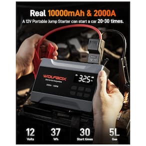 O WOLFBOX é um jump starter portátil com compressor integrado e capacidade de 37Wh, projetado para partida de veículos 12V com motores a gasolina até 5 L, fornecendo corrente de pico de 2000A. Inclui modo BOOST para baterias de baixa voltagem, proteções contra curto-circuito, inversão de polaridade e sobrecarga, além de cabos jumper inteligentes.