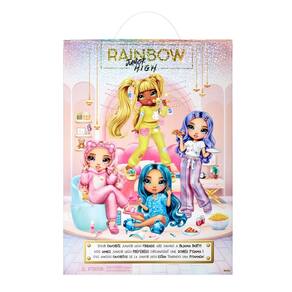 A boneca Rainbow High Jr High PJ Party – com macacão rosa e chinelos combinando Ela possui cabelo longo e encaracolado, olhos de vidro e rosto com traços infantis Totalmente posável, permite diversas poses, incluindo abertura de pernas Seu tema de festa do pijama é spa, com acessórios como máscara de pepino, adesivos para espinhas, rolo facial, máscaras para os olhos, sabonete facial e faixa de cabelo com orelhas fofas Ideal para crianças de 4 a 12 anos, também pode ser combinada com a versão mais velha de Bella, de 11, como irmã mais nova