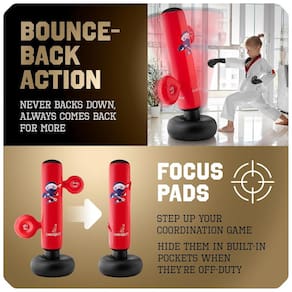 BRINQUEDOS NINJA PARA CRIANÇAS DE 3 A 12 ANOS! O conjunto também pode ser utilizado por adultos. Entre os benefícios para os pequenos estão o aumento da autoconfiança, o aprimoramento dos reflexos, momentos de diversão longe de gadgets e a prática segura das artes marciais. FEITO PARA DURAR! A bolsa é confeccionada em PVC de alta qualidade, com espessura de 0,35 mm, resistente a vazamentos. Todo o conjunto é atóxico e livre de BPA, garantindo a segurança das crianças. As luvas possuem espuma PU de alta densidade e costuras reforçadas para maior durabilidade. MONTAGEM RÁPIDA E FÁCIL! A instalação da bolsa é simples e rápida, levando de 3 a 5 minutos. A bomba manual é eficiente e mais rápida que as elétricas. A base pode ser preenchida com água ou areia para garantir máxima estabilidade durante o uso. Prepare-se para muita diversão e aprendizado com o kit KANGABILITY!