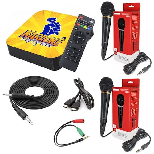 Para facilitar o uso, o kit também conta com um controle remoto e um cabo HDMI. A fonte bivolt 110v/220v garante que você possa utilizar o Karaoke Party Box em qualquer lugar, sem se preocupar com a voltagem.