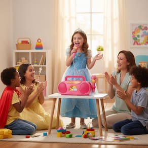 Liberte a estrela que existe em sua pequena com o Boombox e Karaokê das Princesas Disney! Este brinquedo encantador é a porta de entrada para um mundo de melodia e imaginação, permitindo que as crianças cantem suas músicas preferidas e criem momentos inesquecíveis de pura alegria e magia. Perfeito para festas do pijama, brincadeiras em casa ou para desenvolver o talento musical.
