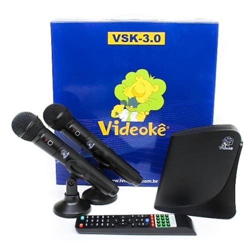 VIDEOKÊ VSK 3.0 COM 9.897 MÚSICAS NA MEMÓRIA + 2 MICROFONES SEM FIOAs 9.897 músicas inclusas na memória são as músicas nacionais da memória convencional + pacotes 01 ao 30 + pacotes internacionais INT01 ao INT10 + pacote INT USA + pacotes JAP01 ao JAP08C.São 6.248 músicas brasileiras, 2.099 músicas internacionais e 1.550 músicas japonesasObs: É recomendado ligar a saída de áudio do Videokê em um equipamento de som.Se for ligado a saída de áudio do Videokê na TV, você não terá um bom resultado, devido a TV possuir alto falantes pequenos de baixa potência, independentemente do modelo de TV.Equipamentos de som recomendados: Amplificador, Caixa Amplificada, Micro System, Home Theather, etc...CARACTERÍSTICAS- Atualização do repertório via internet: Entrada MICRO-SD para atualização de repertório via internet sem sair de casa. Você pode adquirir músicas em pacotes no site www.ivideoke.com.br, com a liberdade de montar seu repertório personalizado. (para uso deste serviço é necessário um computador conectado a internet, um Micro-SD Card e uma porta Micro-SD).- Imagem 4K: Qualidade de imagem em ultra-alta definição HD via conexão HDMI (não é compatível com 8k).- 2 microfones sem fio: O aparelho acompanha 2 microfones sem fio com sistema de pontuação independentes. Ou seja, a pontuação em tempo real aliada ao iFun linhas, "atirando" com a sua voz. Quanto mais a sua voz se manter na melodia e no tom correto, maior será a sua pontuação!- Pontuação em tempo real: Aparelho com sistema de pontuação em tempo real. Sua competição fica ainda mais divertida e fiel, pois o aparelho avalia além do andamento, o tom e o ritmo do cantor.- iFun: Sistema de grade de melodia de voz que orienta a cantar visualizando na tela em que partes deve-se cantar mais agudo ou mais grave. Siga as linhas e cante cada vez melhor!- Rafkara (WLAN - Função de Rede Local Sem Fios): Sincronize o seu Smartphone com o aparelho Videokê e utilize-o como controle remoto.- Gravação de voz: opção de criar uma lista de canções com a sua voz gravada. Cante, grave e armazene na lista ou mostre seu talento para quem você quiser.- Replay: Reinicia a canção mantendo seus ajustes pessoais (opção para treinar suas canções favoritas e melhorar cada vez mais).- Listas na tela: Encontre facilmente as canções que deseja cantar através das listas em ordem de idioma, intérprete ou faça sua própria lista de canções favoritas.DETALHES- Músicas na memória: 9.897 músicas já carregadas na memória do aparelho.- Capacidade de músicas na memória: Até 20.000 músicas.- Seleção de canções pelo código: Basta digitar o código referente a canção escolhida, consultando a lista de canções.- Pontuação: Três graus de dificuldade através do menu, possibilitando facilitar ou dificultar a pontuação.- Controle de Tom: Opções de aumentar 6 semi-tons ou diminuir 6 semi-tons, possibilitando melhor ajuste para a sua extensão vocal.- Controle de Tempo: Opções de 12 níveis de velocidade, além da velocidade original, para treinar canções muito rápidas, executando-as devagar, ou dar "mais ânimo" em canções mais lentas.- Controle de volume de eco: Ajuste de volume de eco dos microfones para criar um efeito especial na sua voz.- Melodia de voz: Acompanhamento de melodia de voz.PRINCIPAIS DIFERENÇAS DO VSK 3.0 PARA OS MODELOS VSK 2.0 e VSK 2.5São muitas as diferenças, mas destacamos as principais:- Melhor qualidade de áudio e vídeo;- Microfones sem fio profissional com melhor qualidade de som;- Pontuação individual por microfone;- Aplicativo Rafkara que controla total o Videokê pelo celular.ESPECIFICAÇÕES TÉCNICASEntradas / Saídas- 1 Entrada para microfone com fio- 1 Entrada Micro-SD para atualização de repertório- 1 Saída HDMI (áudio estéreo digital e vídeo HD/Full HD/4k) (não é compatível com 8k)- 1 Saída P2 (áudio estéreo analógico e vídeo 720x480p)Dimensões do aparelho- Parte inferior base menor: 2,5cm- Parte inferior base maior: 7cm- Parte superior menor: 2cm- Parte superior maior: 4cm- Altura menor: 15,4cm- Altura maior: 17cm- Comprimento maior: 15cm- Comprimento menor: 12cmConteúdo da embalagem– 1 Aparelho de Videokê VSK 3.0 com 9.897 músicas– 1 Cabo HDMI (áudio estéreo digital e vídeo HD/Full HD/4k)– 1 Cabo P2xRCA (áudio estéreo analógico e vídeo 720x480p)– 1 Fonte– 2 Microfones sem fio– 1 Controle RemotoVoltagem- 110V~220V (Bivolt)Sistema de cor- PAL-M / NTSCMedidas da embalagem (AxLxP)- 35,5cm x 9,0cm x 32cm