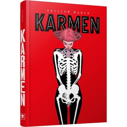 Sensível e deslumbrante. Muitos ângulos para abordar uma dor que vive entre nós. Karmen tem o cabelo cor-de-rosa, sardas no rosto e usa um maiô de esqueleto. Ela é uma espécie de anjo da guarda e faz parte de um grupo de seres que guiam os mortos para a sua próxima vida. Catalina é uma jovem que, em um momento de solidão, fragilidade e desespero, tenta o suicídio. É quando as duas se conhecem, e Karmen vai lhe conduzir em uma jornada de autodescoberta, aprendizado e compaixão. No limbo, Catalina pode fazer o que sempre fantasiou, mas nunca ousou tentar, inclusive loucuras, como bisbilhotar a vida alheia e já que não está sujeita às leis da física aproveitar para experimentar novas sensações, como voar ou mergulhar no tempo que quiser, enquanto os vivos já não conseguem mais vê-la. Nesta fantasia moderna, o quadrinista espanhol Guillem March aborda o delicado tema do suicídio de maneira terna e bem-humorada. Karmen se revela uma história repleta de reviravoltas intrigantes e reflexões metafísicas, por vezes onírica, que mergulha profundamente em assuntos importantes com surpresa e delicadeza, e que poucas vezes recebem uma representação repleta de dignidade e compaixão. Conhecido por seu trabalho anatômico e criativo para a DC Comics em Batman, Mulher-Gato e Coringa, Guillem March realiza em sua primeira obra individual de fôlego um trabalho primoroso, sutil e ao mesmo tempo comovente, ao abordar um assunto importante e por vezes estereotipado em algumas representações artísticas. Iremos acompanhar e descobrir o que teria levado a protagonista a uma atitude tão extrema. É quando as duas partem em uma viagem surreal e onírica literalmente voando pela cidade, que também é protagonista da história. A arte inventiva e deslumbrante de March conduz a dupla e o resultado é pura magia. É nessa jornada que Cata vai conhecer melhor a si mesmo e também as pessoas queridas em sua vida e refletir sobre aquilo que realmente importa. E, quem sabe, ter a oportunidade de r
