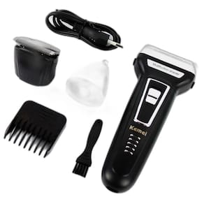 - marca: kemei - modelo número: km-6558 - alimentação: recarregável - característica: lâmina dupla - utilização: corpo, barba, bigode, cabelo, nariz e orelhas. - tempo de uso: até 60 minutos - tempo de carga: 8 horas - tensão: 110-220v - potencia nominal: 3w - material: abs + stainless steel - tamanho: 16cm x 3cm - tipo de item: barbeador elétrico, aparador de pelos e cortador de cabelos