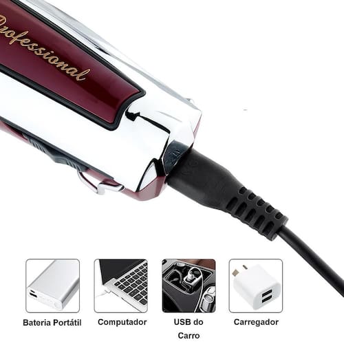 Este modelo é sem fio e recarregável em uma entrada USB, assim você terá todo o conforto de cortar cabelos sem ter cabo lhe atrapalhando. A máquina é leve e boa de se manipular, possui uma bateria de alta duração, uma carga de 5 horas lhe dá 2 horas de uso.