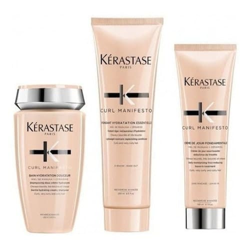Kit com shampoo, condicionador e leave-in para cabelos ondulados, cacheados e crespos. Curl Manifesto Fondamentale garante maciez, proteção, hidratação e definição diária para as curvas dos fios.