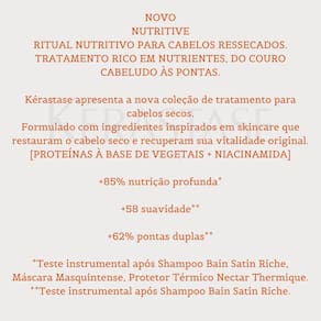 Kérastase Nutritive Bain Satin Shampoo para cabelos secos. Kérastase Nutritive Bain Satin promove uma limpeza intensa ao mesmo tempo que confere maciez aos fios. Conselho de Aplicação Primeiro, distribua o produto na palma da mão. Aplique no cabelo molhado em seções, a partir da raiz, e massageie com as pontas dos dedos sem usar as unhas , levando o produto pelo comprimento até as pontas. Enxágue bem e repita o procedimento. Recomendação de quantidade: 5ml ou uma colher de chá para cabelo curto, 10ml 2 colheres de chá para médio e 15ml 1 colher de sopa para longo por aplicação. Marca: Não Informado