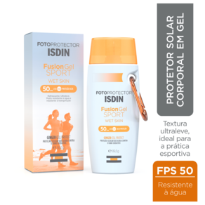 Protetor solar corporal em gel. ISDIN Fusion Gel Sport FPS 50 protege a pele com uma textura invisível que não deixa resíduo oleoso.