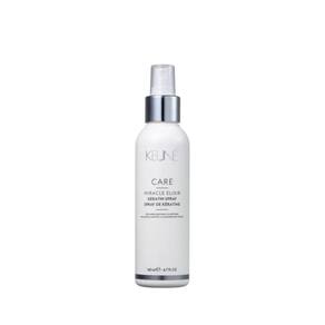 Spray de tratamento para cabelos danificados. Keune Care Miracle Elixir Keratin Spray faz uma reconstrução dos fios enquanto amacia e mantém a hidratação. Prolonga os efeitos do tratamento Keune Care Miracle Elixir feito no salão por até 5 lavagens.