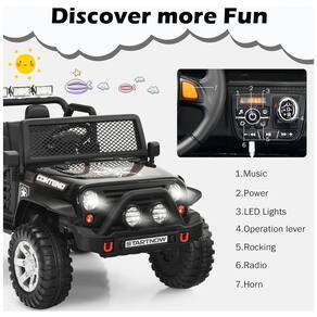Dois modos de controle 1. Pedais e volante são uma maneira de as crianças dirigirem o carro. 2. O uso do controle remoto parental bateria AAA de 1,5 V não incluída é o contrário. E o último substitui o primeiro. Além disso, há uma alça embaixo do carro para facilitar a movimentação, caso você esqueça de carregar o suficiente na noite passada. Um passeio e suave este caminhão de passeio de 12V possui suspensão de mola dianteira e traseira e uma função de partida lenta para garantir um tempo de reprodução em quase todos os terrenos. Sempre coloque seus filhos no cinto de segurança quando eles entrarem no carro e o amplo assento garante que o passeio seja confortável e alegre. Experiência de condução realista com portas que podem ser abertas, janela frontal de grade ou volante, todos os detalhes requintados são imitados do caminhão real. O carro anda para frente e para trás, e também tem um modo de balanço. Nosso brinquedo de carro ruge quando você liga, as buzinas podem apitar e, com as luzes LED piscando, seu pequeno piloto recebe um passeio o mais realista possível. Opções de música e áudio Com música, este carro de passeio consegue trazer mais alegria para as crianças. Sistema de controle integrado ao equipamento para aumentar muito mais prazer. MP3, saída USB, funções que significam conectar outros dispositivos de música ou conectar telefones para obter mais opções de áudio para a preferência de seus filhos. Um presente de perfeição nosso carro de passeio vem com várias opções de cores e será um grande incentivo para seus filhos com mais de 3 anos. A tampa de PP sólida torna o carro de passeio um prazer duradouro com um peso máximo de 49 kg. Requer 8 12h de carregamento para 1 hora de diversão Marca: Não Informado