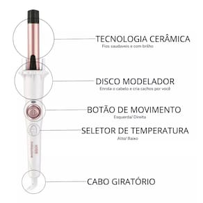 Características Cabelo ondulado perfeito em minutos Tecnologia de cerâmica Disco modelador automático Temperatura máxima de 200°C Bivolt automático Cabo giratório Função sonora que avisa quando o cacho está pronto Potência: 40W