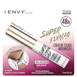 Cola incolor à prova d'água para cílios postiços. Kiss New York i-Envy Super Fixação 48h Incolor fixa de maneira resistente e com acabamento imperceptível, sem deixar marcas. Sua fórmula é potente, o que garante até 48 horas de aderênica.