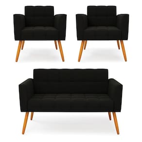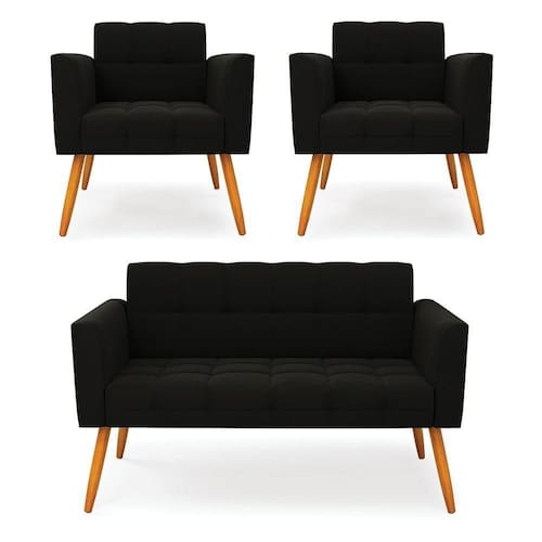 Kit 01 Namoradeira e 02 Poltronas Elisa Suede Preto Pés Palito Castanho D'Rossi