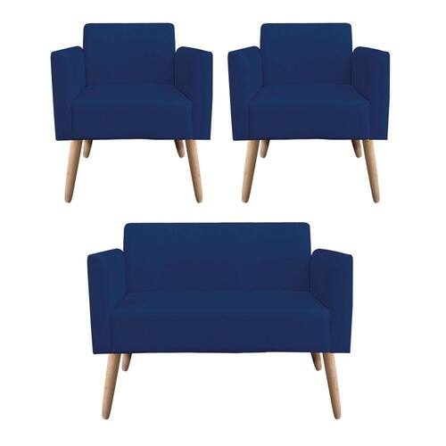 Kit 01 Namoradeira e 02 Poltronas Marisa Suede Azul Marinho Pés Palito Natural D'Rossi