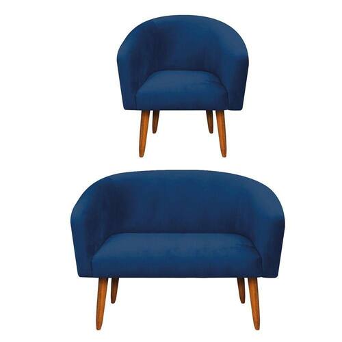 Kit 01 Namoradeira e 01 Poltrona Stella Suede Azul Marinho Pés Palito Castanho Drossi