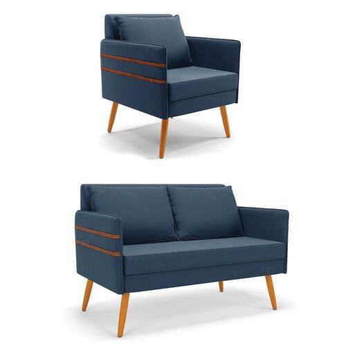 Que tal o kit Namoradeira e Poltrona Mari? Imagine-se utilizando esse kit e usufruindo de todos os benefícios que ele oferece. Pode ser utilizado para evidenciar e enriquecer o seu ambiente, descansar depois de um dia longo de trabalho, ver aquela série favorita ou simplesmente ler seu livro predileto. A estrutura deste conjunto é confeccionada em madeira de eucalipto proveniente de reflorestamento, suportando em média até 120 Kg, possuí pés palito castanho, garantindo uma maior resistência e durabilidade ao produto, o estofamento do assento e encosto é composto de espuma D-23, revestido em tecido Suede no tom Azul Marinho. Então, se a sua dificuldade é a otimização de espaço, este Kit além de confortável e sofisticado, traz toda a funcionalidade que você precisa. Apenas alguns conjuntos estão disponíveis, separe o seu Kit 01 Namoradeira e 01 Poltrona Mari antes que acabem!