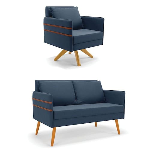 Que tal o kit Namoradeira e Poltrona Mari? Imagine-se utilizando esse kit e usufruindo de todos os benefícios que ele oferece. Pode ser utilizado para evidenciar e enriquecer o seu ambiente, descansar depois de um dia longo de trabalho, ver aquela série favorita ou simplesmente ler seu livro predileto. A estrutura deste conjunto é confeccionada em madeira de eucalipto proveniente de reflorestamento, suportando em média até 120 Kg, a namoradeira possuí pés palito castanho, e a cadeira possui base giratória de madeira, garantindo uma maior resistência e durabilidade ao produto, o estofamento de ambas (assento/encosto) são compostas de espuma D-23, revestidos em tecido Suede. Então, se a sua dificuldade é a otimização de espaço, este Kit além de confortável e sofisticado, traz toda a funcionalidade que você precisa. Apenas alguns conjuntos estão disponíveis, separe o seu Kit 01 Namoradeira e 01 Poltrona Giratória Mari antes que acabem! Dimensões da Namoradeira: Altura total: 82 cm Largura total: 110 cm Profundidade total: 74 cm Altura do encosto: 35 cm Largura do assento: 104 cm Profundidade do assento: 57 cm Altura do chão ao assento: 47 cm Espessura do assento: 22 cm Altura do chão ao braço: 46 cm Altura interna do braço: 19 cm Tamanho dos pés: 25 cm Espessura do braço: 4 cm Peso: 20 kg Dimensões da Poltrona: Altura total: 82 cm Largura total: 63 cm Profundidade total: 74 cm Altura do encosto: 51 cm Largura do assento: 54 cm Profundidade do assento: 57 cm Altura do chão ao assento: 47 cm Espessura do assento: 22 cm Altura do chão ao braço: 46 cm Altura interna do braço: 19 cm Tamanho dos pés: 25 cm Espessura do braço: 4 cm Peso: 15 kg Dimensões da Almofada: Altura total: 34 cm Largura total: 51 cm Profundidade total: 20 cm Peso: 0,3 kg Especificações do Produto Estrutura: Madeira Eucalipto Espuma: D-23 Tecido: Suede Tipo de pés: Pés Palito e Base Giratória Peso suportado: Até 120 Kg Garantia: 90 dias contra defeito de fabricação Montagem: O produto vai montado, apenas rosquear os pés Instruções de limpeza: Utilizar um pano limpo e levemente úmido Você irá receber: 03 Volumes com 01 Namoradeira e 02 Poltronas Observações Relevantes - Todos os produtos vão embalados com total segurança; - As cores dos produtos podem sofrer alterações dependendo do seu monitor; - Para futuras compras, não garantimos a mesma tonalidade de cor, pois existe variação a cada lote do fabricante do tecido; - As imagens são meramente ilustrativas, não acompanham objetos de decoração e eletros; - Confira as dimensões do produto no momento da compra e certifique-se de que passará normalmente por escadas, elevadores, portas e corredores; - Importante: Por se tratar de estofado as medidas podem ter uma pequena variação em até 3 cm; - Não nos responsabilizamos no ato da entrega por montagens, desmontagens, instalações de produtos; - Não nos responsabilizamos no ato da entrega por subir escadas, elevadores, nem utilização de guinchos ou equipamentos similares para acesso a pisos superiores em apartamentos; - A entrega do produto é realizada em todo território nacional, até onde as rodovias alcançam, entregas fluviais ou aéreas devem ser cotadas a parte; - Observando as orientações acima, evita-se futuros desagrados ou imprevistos com a entrega do produto. Havendo despesas adicionais, serão de responsabilidade do cliente;