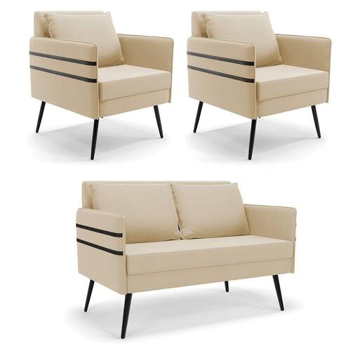 Que tal o kit Namoradeira e Poltrona Mari? Imagine-se utilizando esse kit e usufruindo de todos os benefícios que ele oferece. Pode ser utilizado para evidenciar e enriquecer o seu ambiente, descansar depois de um dia longo de trabalho, ver aquela série favorita ou simplesmente ler seu livro predileto. A estrutura deste conjunto é confeccionada em madeira de eucalipto proveniente de reflorestamento, suportando em média até 120 Kg, possuí Pés Palito de Ferro, garantindo uma maior resistência e durabilidade ao produto, o estofamento do assento e encosto é composto de espuma D-23, revestido em tecido Suede. Então, se a sua dificuldade é a otimização de espaço, este Kit além de confortável e sofisticado, traz toda a funcionalidade que você precisa. Apenas alguns conjuntos estão disponíveis, separe o seu Kit 01 Namoradeira e 02 Poltronas Mari antes que acabem! Dimensões da Namoradeira: Altura total: 82 cm Largura total: 110 cm Profundidade total: 74 cm Altura do encosto: 35 cm Largura do assento: 104 cm Profundidade do assento: 57 cm Altura do chão ao assento: 47 cm Espessura do assento: 22 cm Altura do chão ao braço: 46 cm Altura interna do braço: 19 cm Tamanho dos pés: 25 cm Espessura do braço: 4 cm Peso: 20 kg Dimensões da Poltrona: Altura total: 82 cm Largura total: 63 cm Profundidade total: 74 cm Altura do encosto: 51 cm Largura do assento: 54 cm Profundidade do assento: 57 cm Altura do chão ao assento: 47 cm Espessura do assento: 22 cm Altura do chão ao braço: 46 cm Altura interna do braço: 19 cm Tamanho dos pés: 25 cm Espessura do braço: 4 cm Peso: 15 kg Dimensões da Almofada: Altura total: 34 cm Largura total: 51 cm Profundidade total: 20 cm Peso: 0,3 kg Especificações do Produto Estrutura: Madeira Eucalipto Espuma: D-23 Tecido: Suede Tipo de pés: Pés Palito de Ferro Peso suportado: Até 120 Kg Garantia: 90 dias contra defeito de fabricação Montagem: O produto vai montado, apenas rosquear os pés Instruções de limpeza: Utilizar um pano limpo e levemente úmido Você irá receber: 03 Volumes com 01 Namoradeira e 02 Poltronas Observações Relevantes - Todos os produtos vão embalados com total segurança; - As cores dos produtos podem sofrer alterações dependendo do seu monitor; - Para futuras compras, não garantimos a mesma tonalidade de cor, pois existe variação a cada lote do fabricante do tecido; - As imagens são meramente ilustrativas, não acompanham objetos de decoração e eletros; - Confira as dimensões do produto no momento da compra e certifique-se de que passará normalmente por escadas, elevadores, portas e corredores; - Importante: Por se tratar de estofado as medidas podem ter uma pequena variação em até 3 cm; - Não nos responsabilizamos no ato da entrega por montagens, desmontagens, instalações de produtos; - Não nos responsabilizamos no ato da entrega por subir escadas, elevadores, nem utilização de guinchos ou equipamentos similares para acesso a pisos superiores em apartamentos; - A entrega do produto é realizada em todo território nacional, até onde as rodovias alcançam, entregas fluviais ou aéreas devem ser cotadas a parte; - Observando as orientações acima, evita-se futuros desagrados ou imprevistos com a entrega do produto. Havendo despesas adicionais, serão de responsabilidade do cliente;