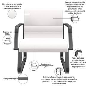 ColorFamily: Branco | Modelo detalhado: Lev com Braços Base Preta | Color: Branco | Tipo de cadeira de escritório: Cadeira Recepção, Sala de Espera | Com apoio de braços: Sim | ColorSimple: Branco | MaterialFamily: Vinil | Material: Tubo de Aço Carbono, Espuma ível Poliuretano, Vinil | de registrocertificação INMETRO: ABNT NBR 13962, ABNT ABNT NM 300, NR 17 | Modelo: Lev | Model: Lev | Com rodas: Não | Material do estofamento: Vinil | Com aro para pés: Não | SupplierSimpleName: Kit 02 Cadeiras de Escritório Recepção Fixa Pés Preto Lev P03 Vinil Branco - Lyam Decor | ProductWidth: 77 cm | ProductWarranty: 90 dias após o do produto | ProductLength: 66 cm | ProductInstructions: Produto para uso em ambiente interno, nao devendo ficar exposto ao sol, calor e umidade excessivos. | Materiais do aro para pés: na | SizeDescription: Altura: 82 cm x Largura: 77 cm x Profundidade: 66 cm | OriginState: PR | ProductContents: 02 Cadeiras, manual de instruções | Requer montagem: Sim | OriginCountry: | ProductHeight: 82 cm | ProductWeight: 30 kg | Cor: Branco | ColorSupplier: Branco | Formato de venda: Kit
