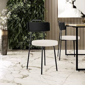 Revestimento do encosto em Couríssimo na cor Preto e do assento em Linho na cor Cru, com acabamento semi brilho.