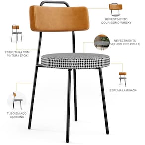 Revestimento do encosto em Couríssimo na cor Whisky e do assento em Veludo na cor Pied Poule, com acabamento semi brilho.