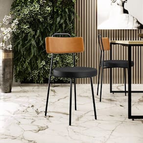 Revestimento do encosto em Couríssimo na cor Whisky e do assento em Couríssimo na cor Preto, com acabamento semi brilho.