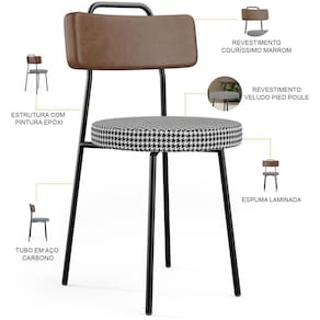 Revestimento do encosto em Couríssimo na cor Marrom e do assento em Veludo na cor Pied Poule, com acabamento semi brilho.