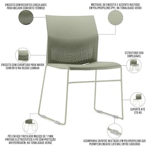 Material do encosto e assento injetado em Polipropileno (PP), na tonalidade Verde.