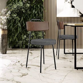 Revestimento do encosto em Couríssimo na cor Marrom e do assento em Linho na cor Cinza Escuro, com acabamento semi brilho.