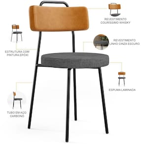 Revestimento do encosto em Couríssimo na cor Whisky e do assento em Linho na cor Cinza Escuro, com acabamento semi brilho.