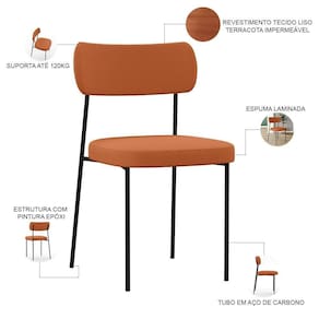 Encosto e assento estofados com espuma laminada. Estrutura fixa em aço carbono com pintura epóxi na cor preto. Revestimento em Tecido Terracota Impermeável. Peso suportado: Até 120 kg.