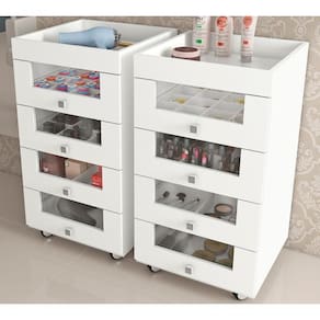 Kit Com 02 Carrinhos Organizador de Maquiagem PE2009, perfeito para você organizar seus itens de maquiagem, perfumes, escovas e acessórios em um só lugar, estrutura resistente em MDP de 15mm, pintura com acabamento em Uv (Brilho). Conta com uma bandeja no topo da peça que deixa tudo mais a mão, são gavetas com corrediças telescópicas com fechamento leve e suave, divisores internos setorizados para organizar seus itens de forma super funcional, assim você terá muito mais praticidade ao escolher seu item, possui quatro rodizios que deslizam com facilidade, a frente das gavetas são de vidro tornando possivel enxergar oque você precisa com mais rapidez, puxadores são modernos e cromados, esta peça é ideal para seus acessórios de beleza mas você pode usar sua imaginação e usar no ambiemte que precisar. Estes móveis chegarão em sua casa separados em 02 volumes.