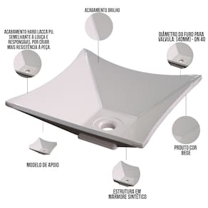 Estrutura em Mármore Sintético com acabamento Hard Lacca PU, semelhante a louça e responsável por criar mais resistência a peça.
