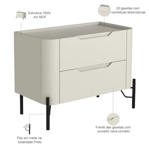 Com design orgânico e influência industrial, essa peça une linhas curvas suaves e pés metálicos, criando um equilíbrio entre delicadeza e contemporaneidade. Os puxadores cava garantem um visual clean, enquanto o MDF de alta qualidade assegura resistência e durabilidade. Compacta mas espaçosa, essa mesa de cabeceira moderna conta com 2 gavetas, oferecendo organização sem perder o charme. Afinal, seu estilo versátil combina com os mais variados ambientes, desde quartos modernos até closets sofisticados, tornando-se a escolha certa para quem busca praticidade sem abrir mão do design.
