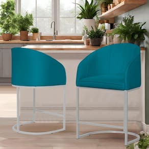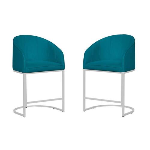 Kit 02 Poltronas Banqueta Mia Estofada Tecido Em Suede Base Metal Branco - Estopar - Azul Turquesa